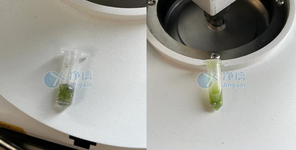 (左:拟南芥叶片装管图,右:研磨效果图)