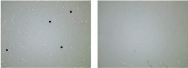 显微镜观察细胞几乎全部破碎(左图处理前,右图处理后)