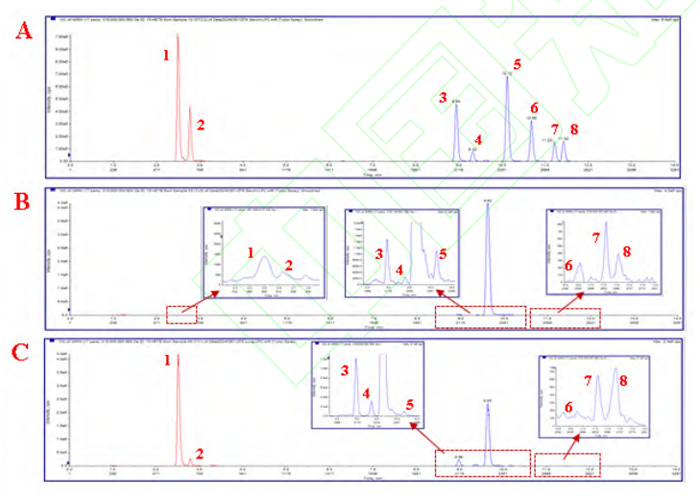 注:a.对照品;b.血清;c.肺组织;1.pge2;2. pgd2;3. 15-hete;4. 11(s)-hete;5. 5-hete;6. 14,15-eet;7. 11,12-eet;8. 8,9- eet