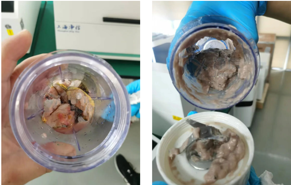 本次实验使用上海净信的平行研磨仪对鱼肉研磨后的肉泥非常均匀,无大块颗粒,鱼皮也被研磨充分,实验效果非常好,用户很满意。