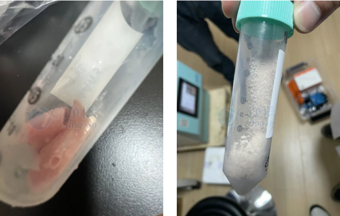 上图为1分钟的研磨效果,已经完全研磨完成。效果非常好,冷冻研磨仪一次可以研磨2个样品,大大提高了之前用手磨的效率和效果,所以人工研磨特别不方便,经过多次了解和对比所以老师选用净信冷冻研磨仪代替人工处理。效率高,效果好。解决了老师的研磨问题。