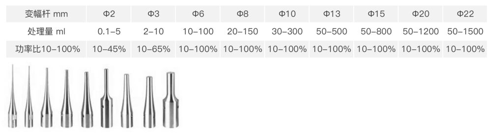 3.超声探头采用美标tc4材质的高纯钛合金,探头形状:锥形、鞭节形,发波形式:垂直超声